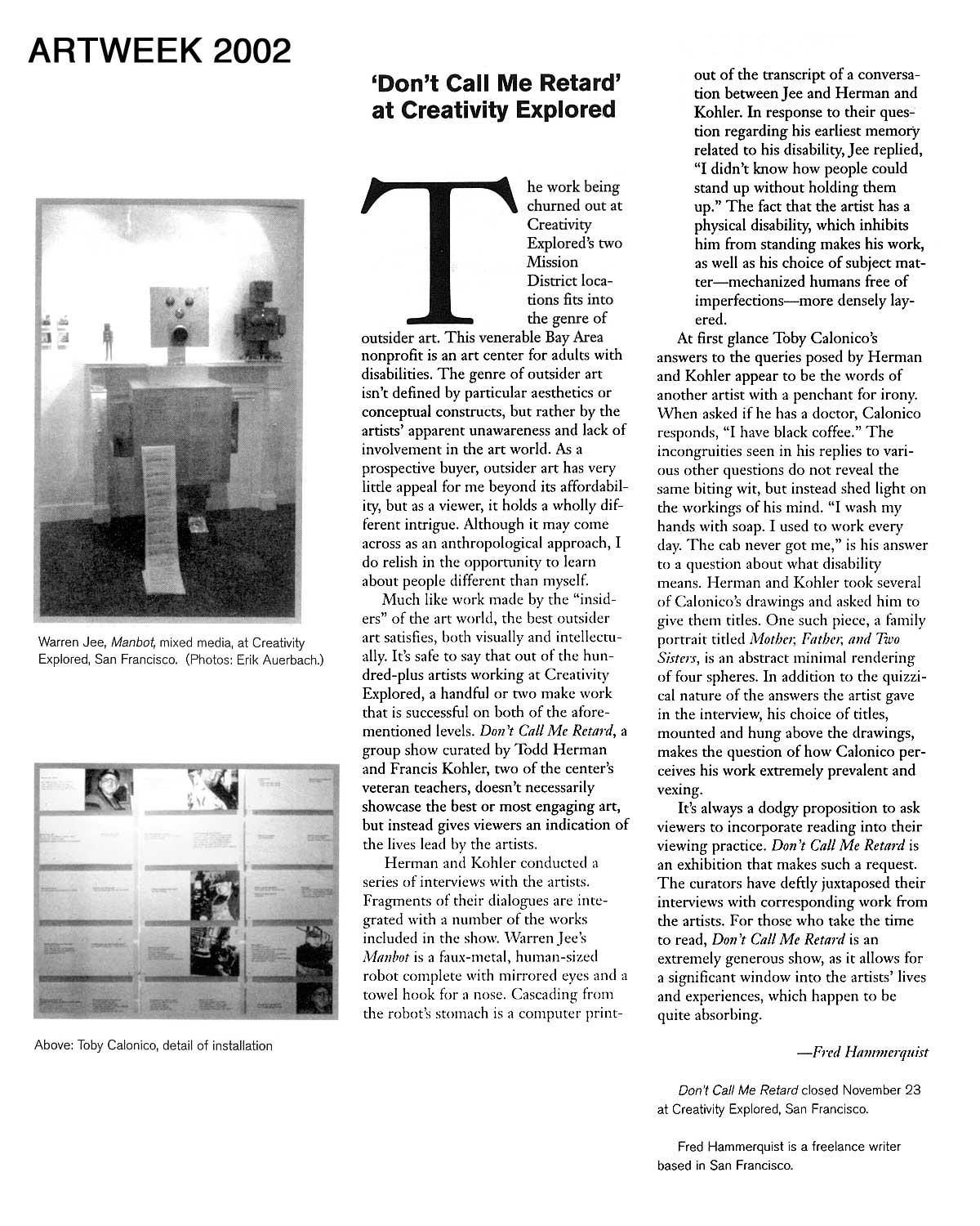 The Jewett Gallery and Creativity Explored a San Francisco based art center providing artistic instruction for adults with developmental disabilities, presents Don't Call Me Retard, an exhibition of films, paintings looking at the stereotypes, issues and daily realities of persons living with a disability.
